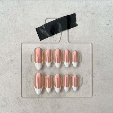 Classic French white tips on a nudish pink base finished with holographic effect.