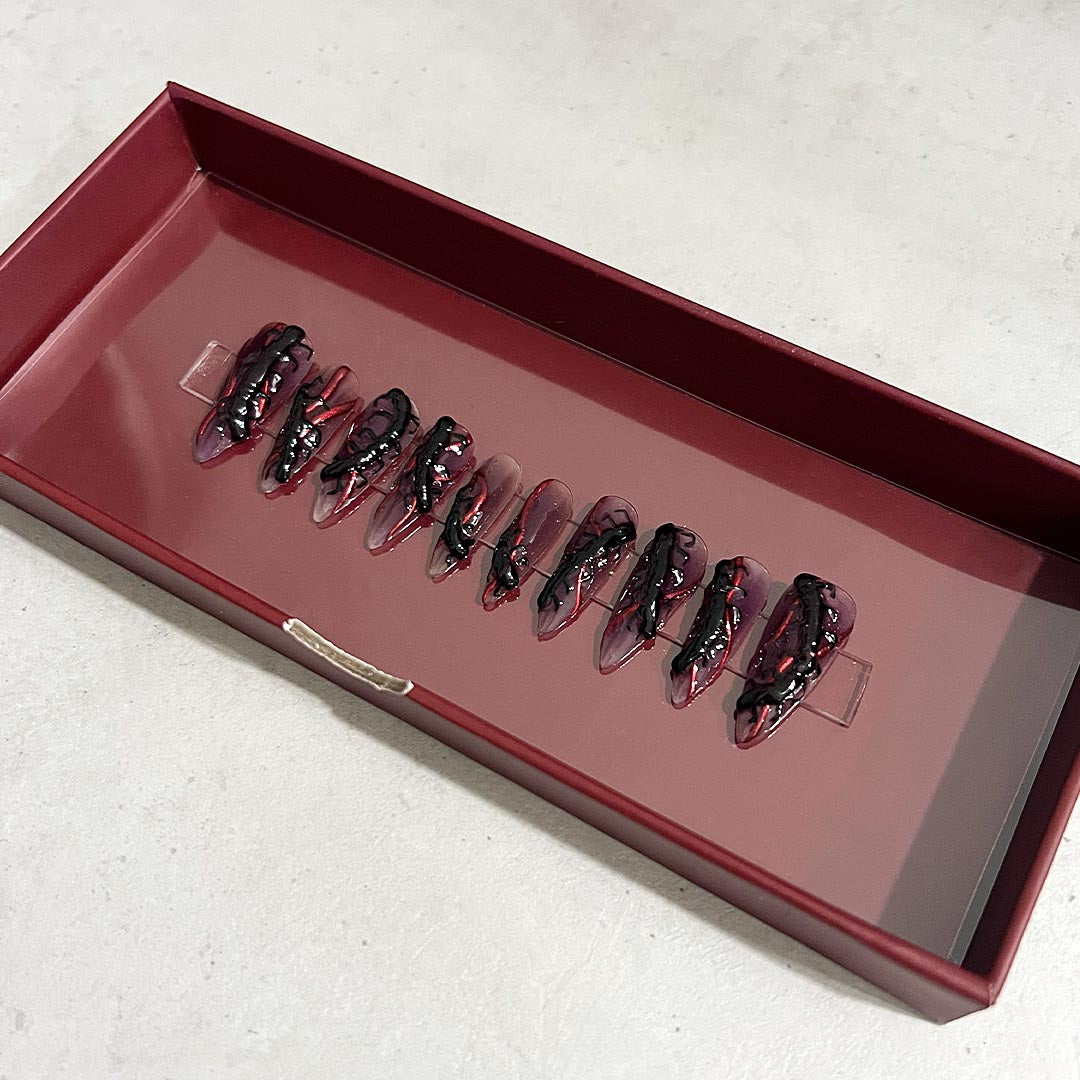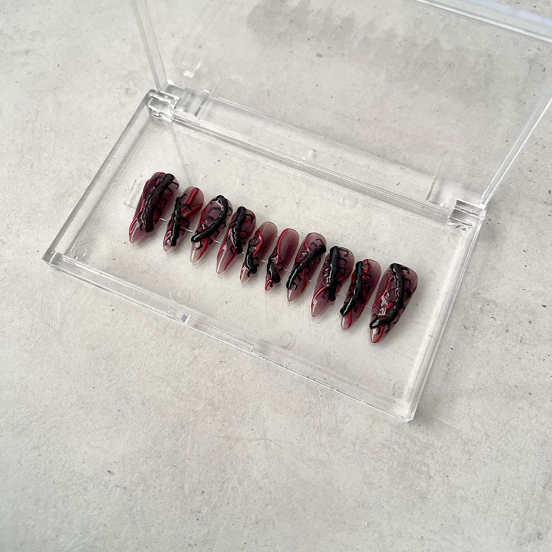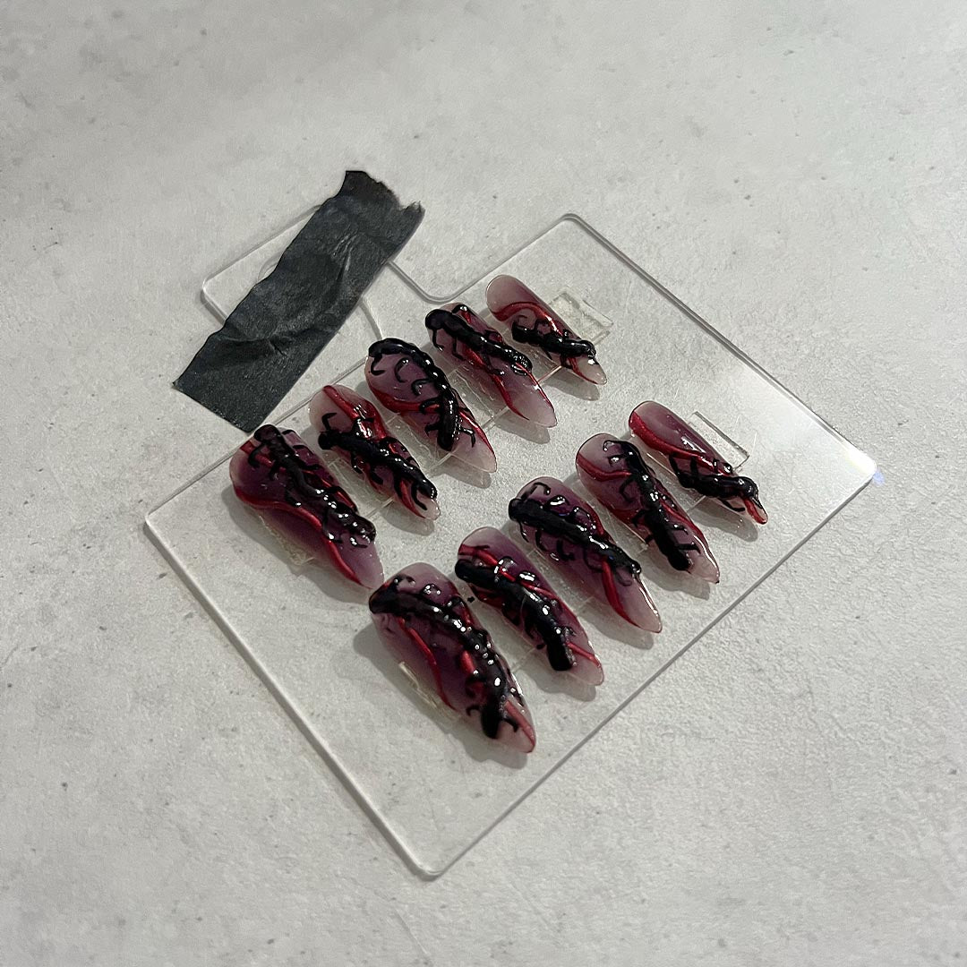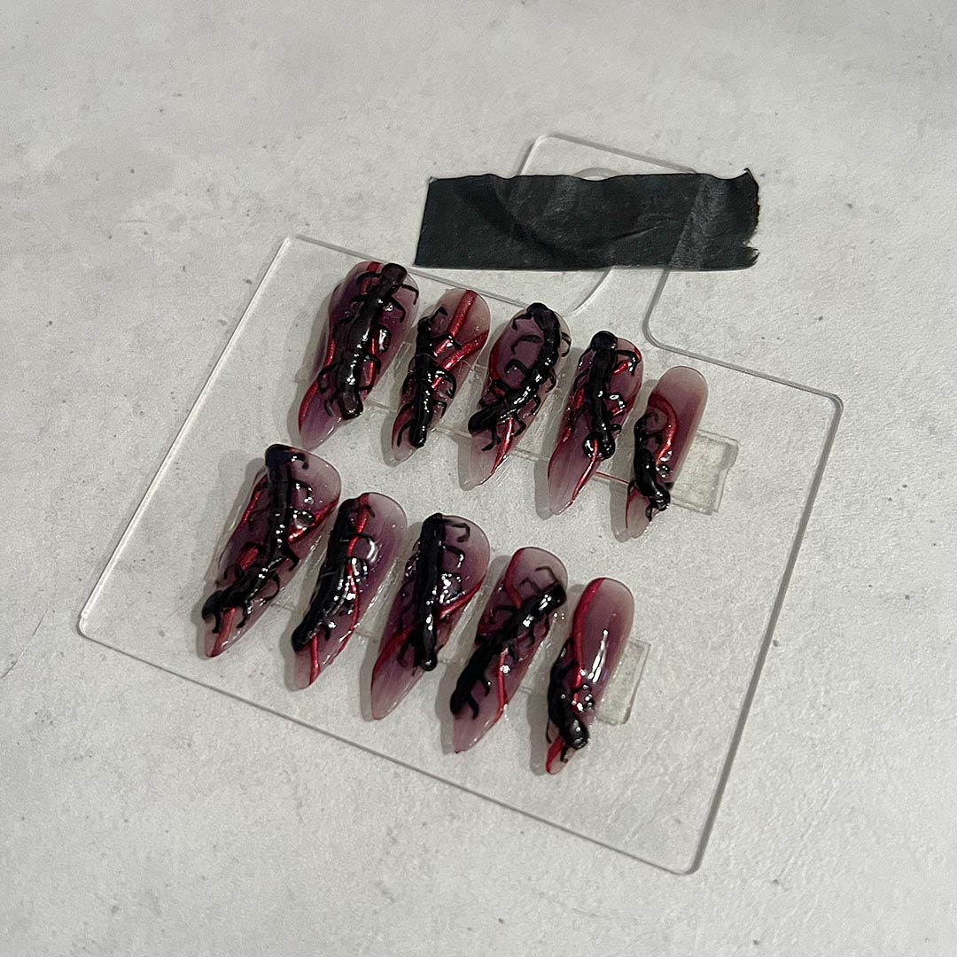 Unleash your inner spooky queen with creepy crawlies in 3D effect, paired with a bold red chrome accent, all on an ombre blackberry colored base. Get that otherworldly look.