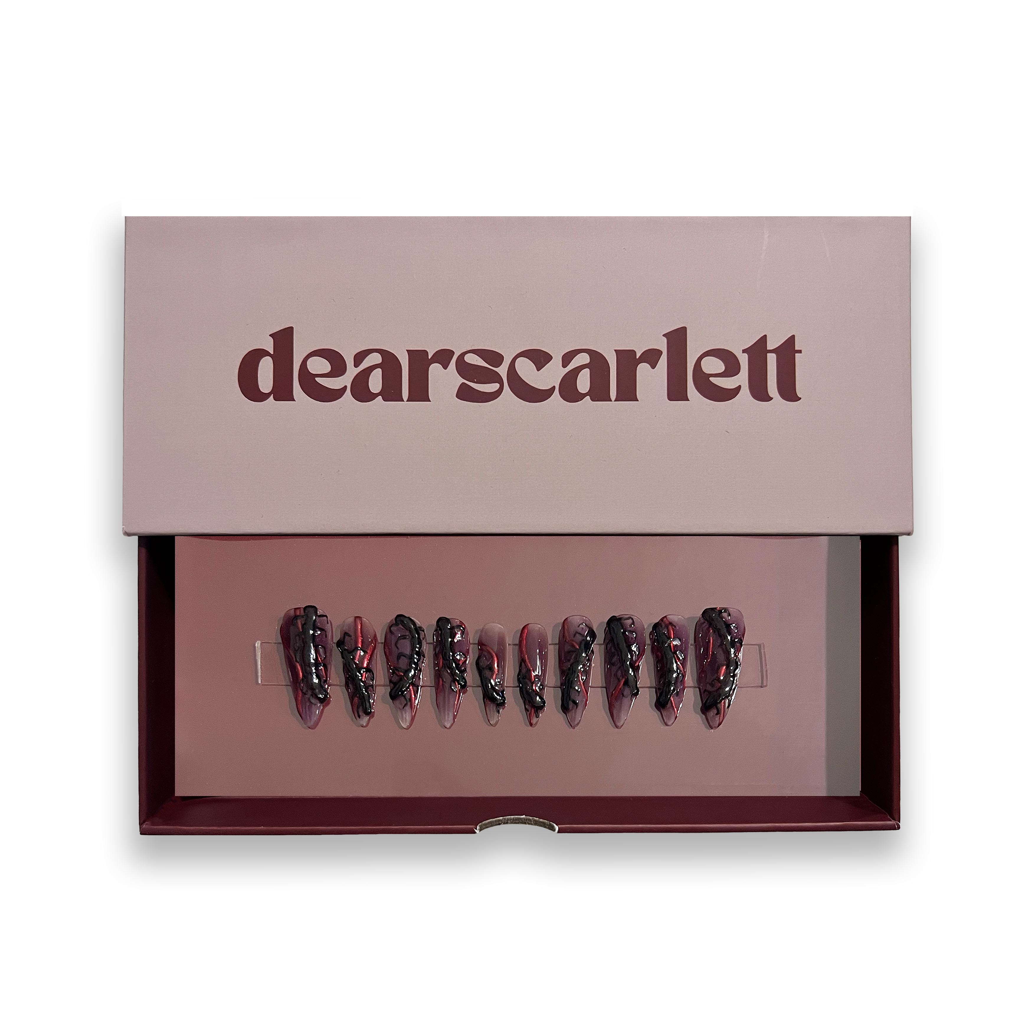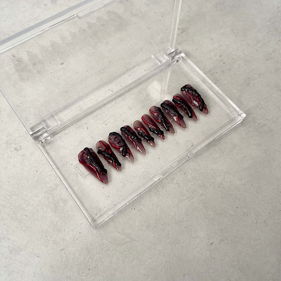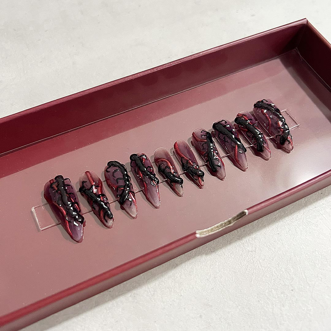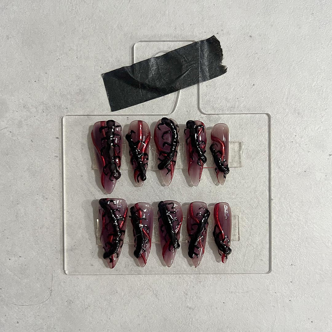 Unleash your inner spooky queen with creepy crawlies in 3D effect, paired with a bold red chrome accent, all on an ombre blackberry colored base. Get that otherworldly look.