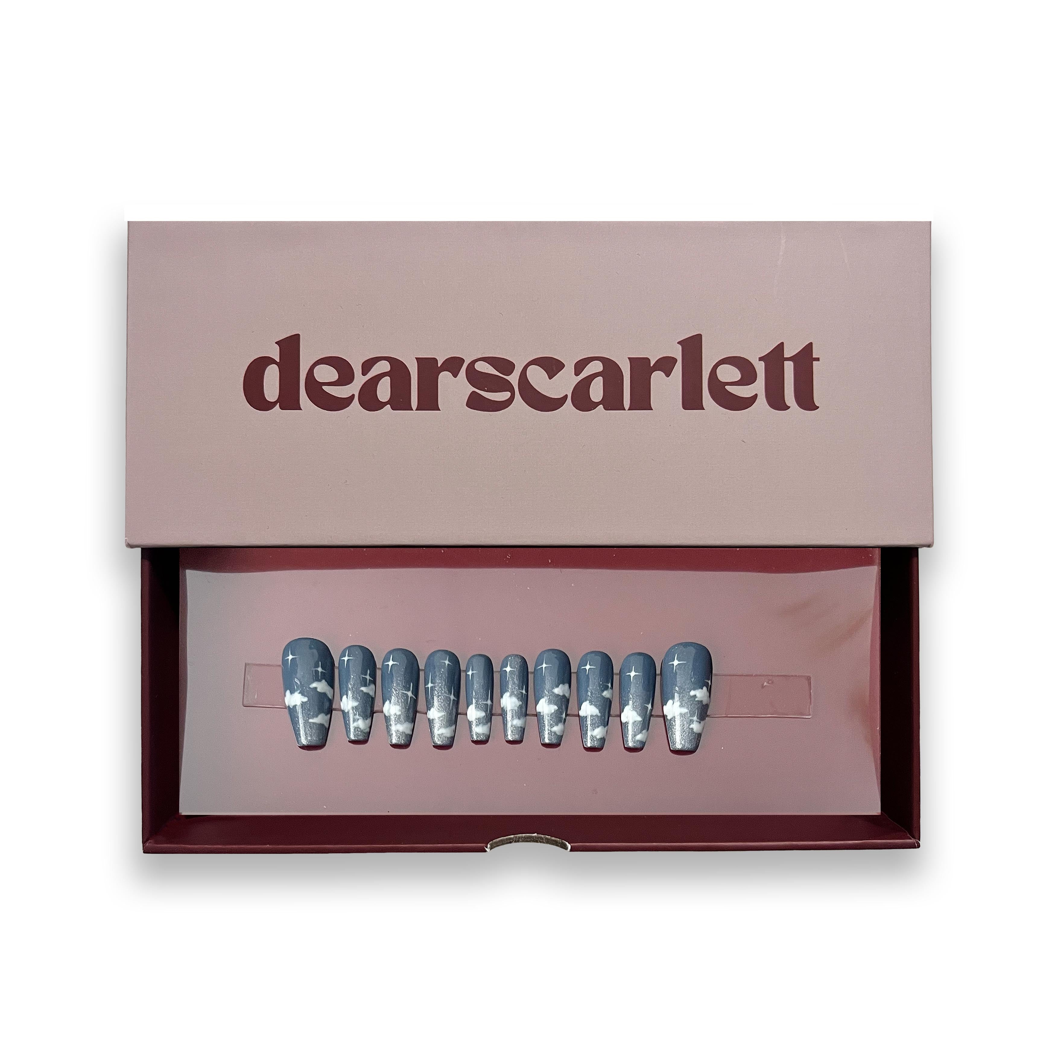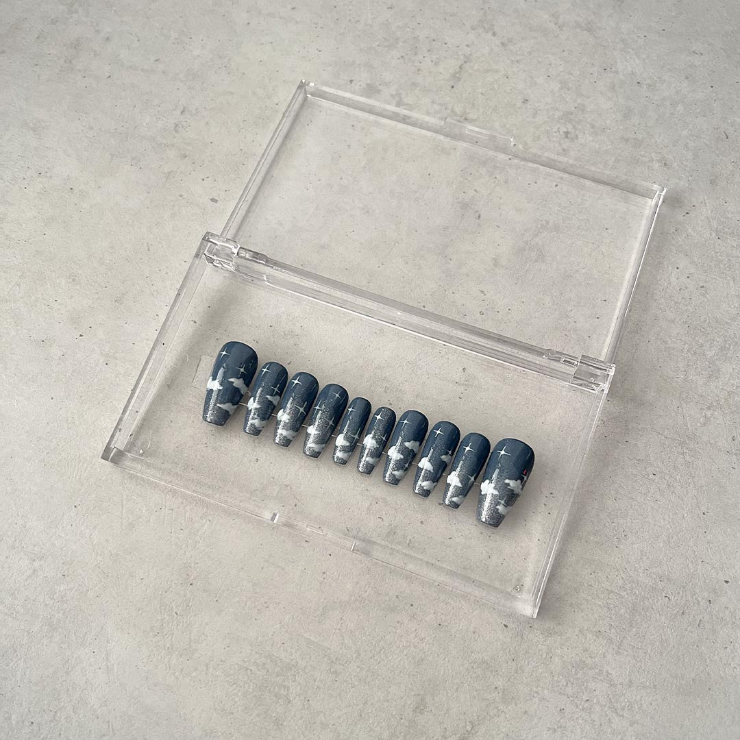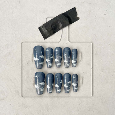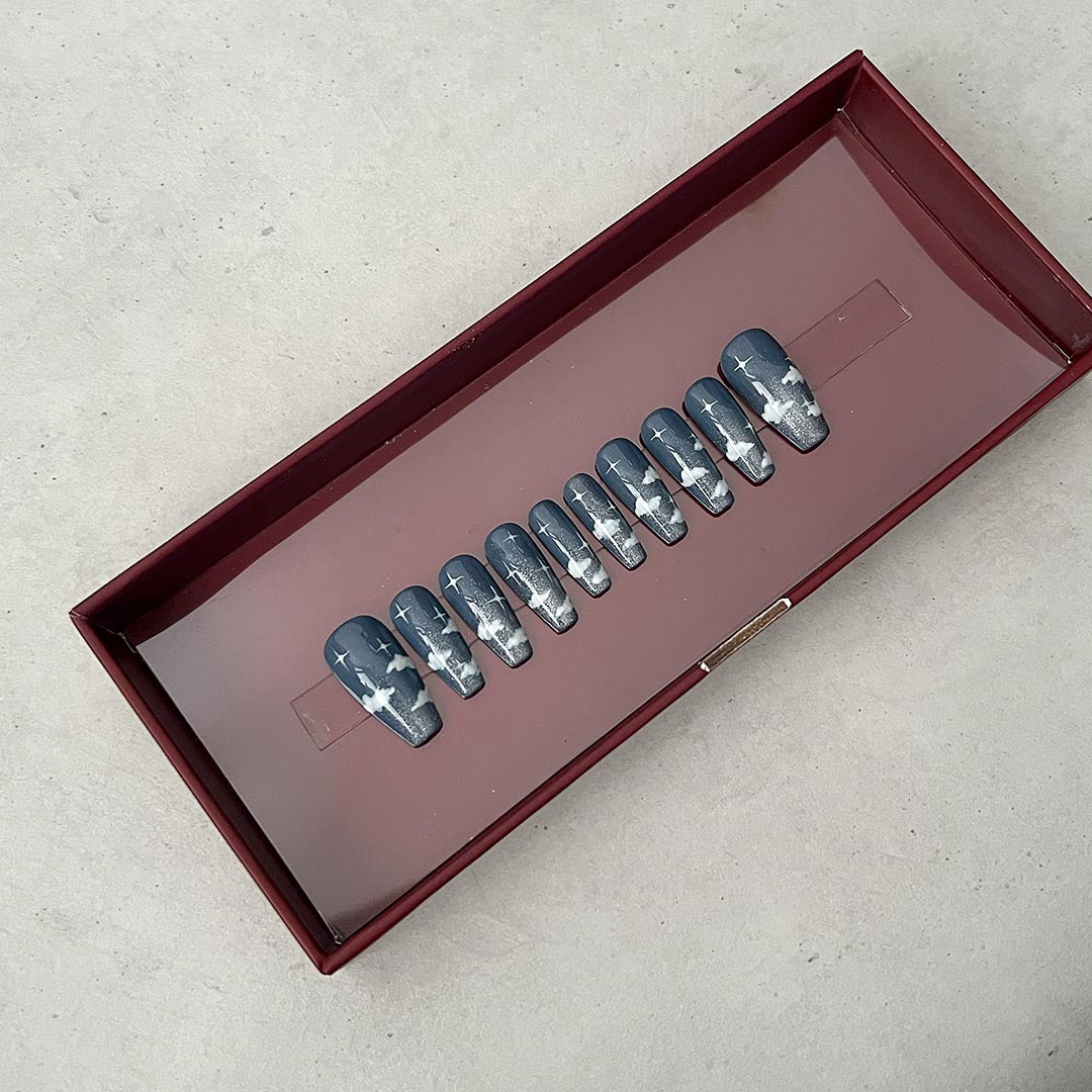 Boldly take on the night with a deep denim blue base and cat eye tips, sparkling with glitter and complete with dreamy clouds and stars.