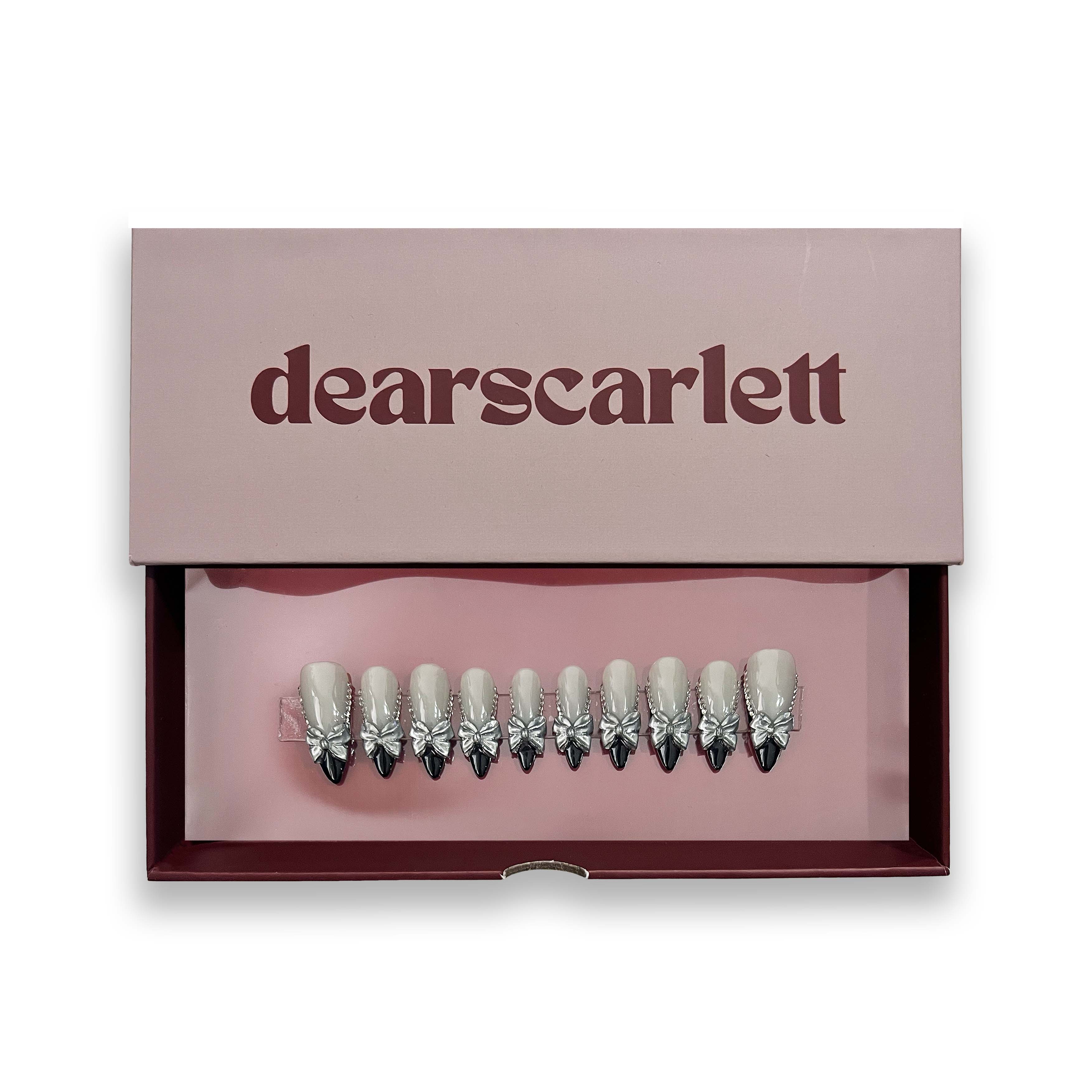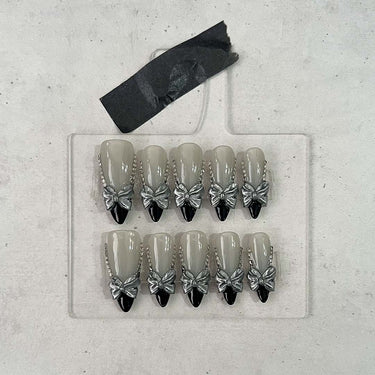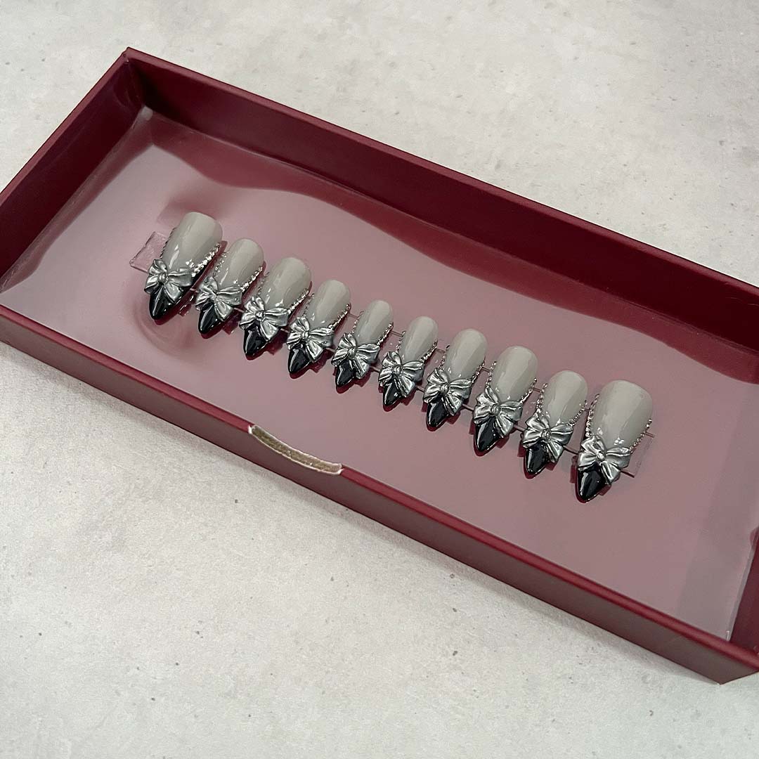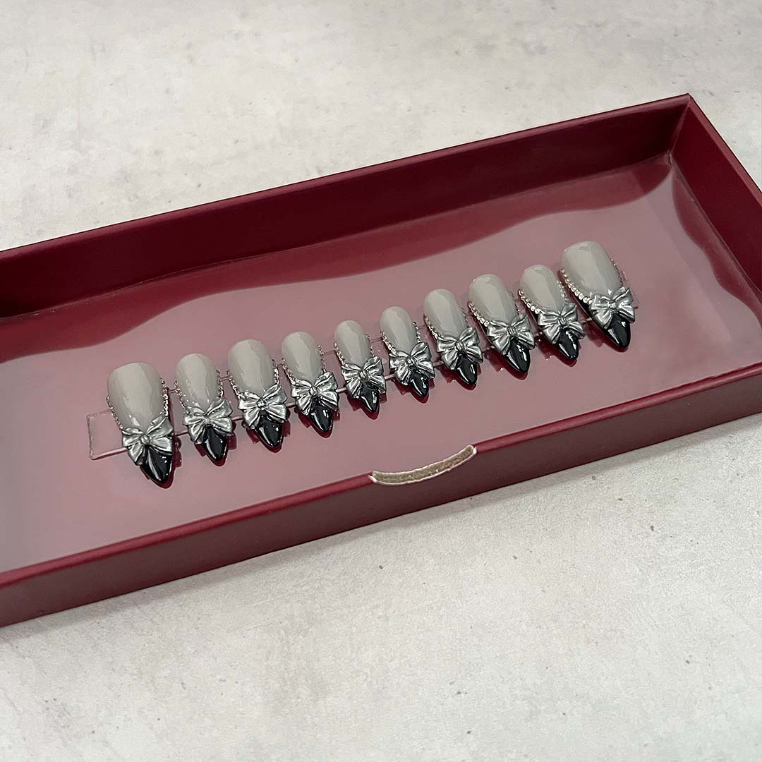 Featuring a translucent base with bold black french tips. Adorned with a metallic bow and sparkling crystals.