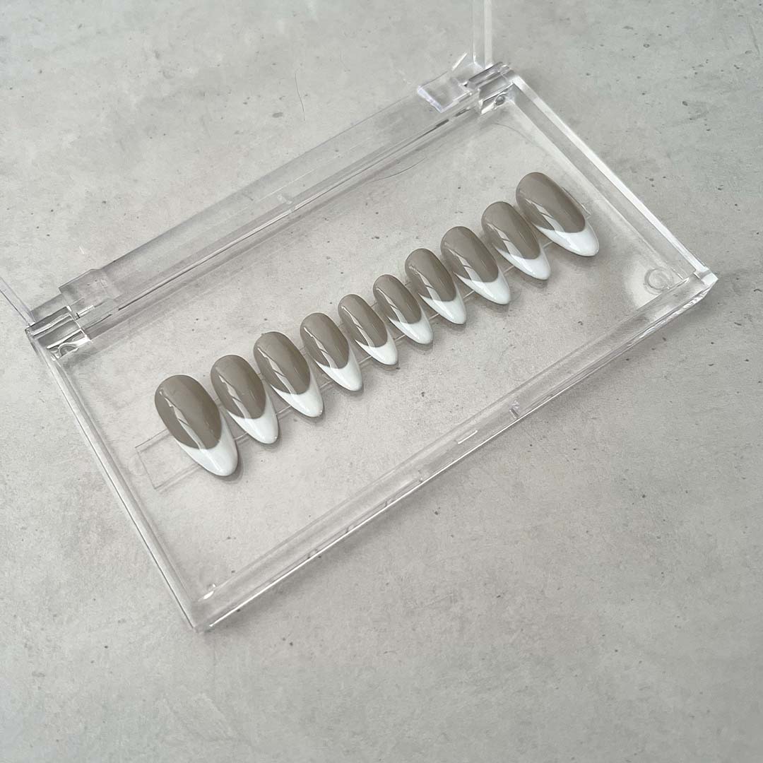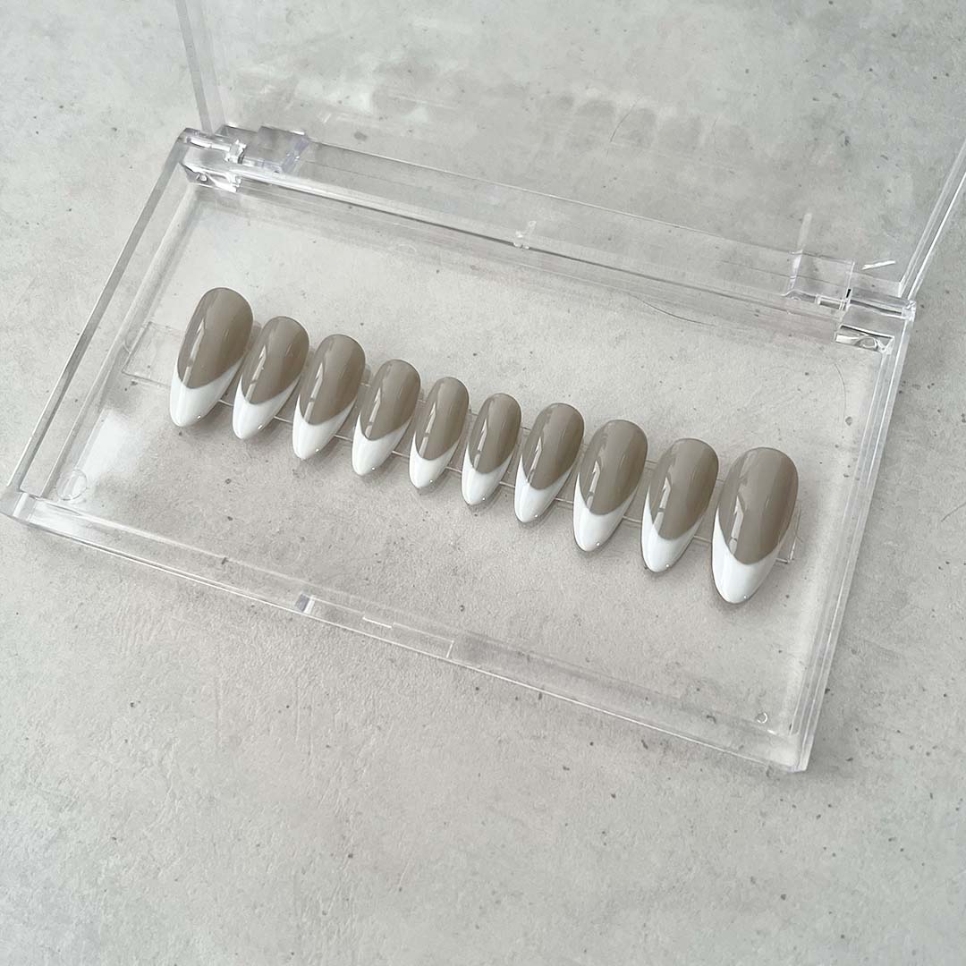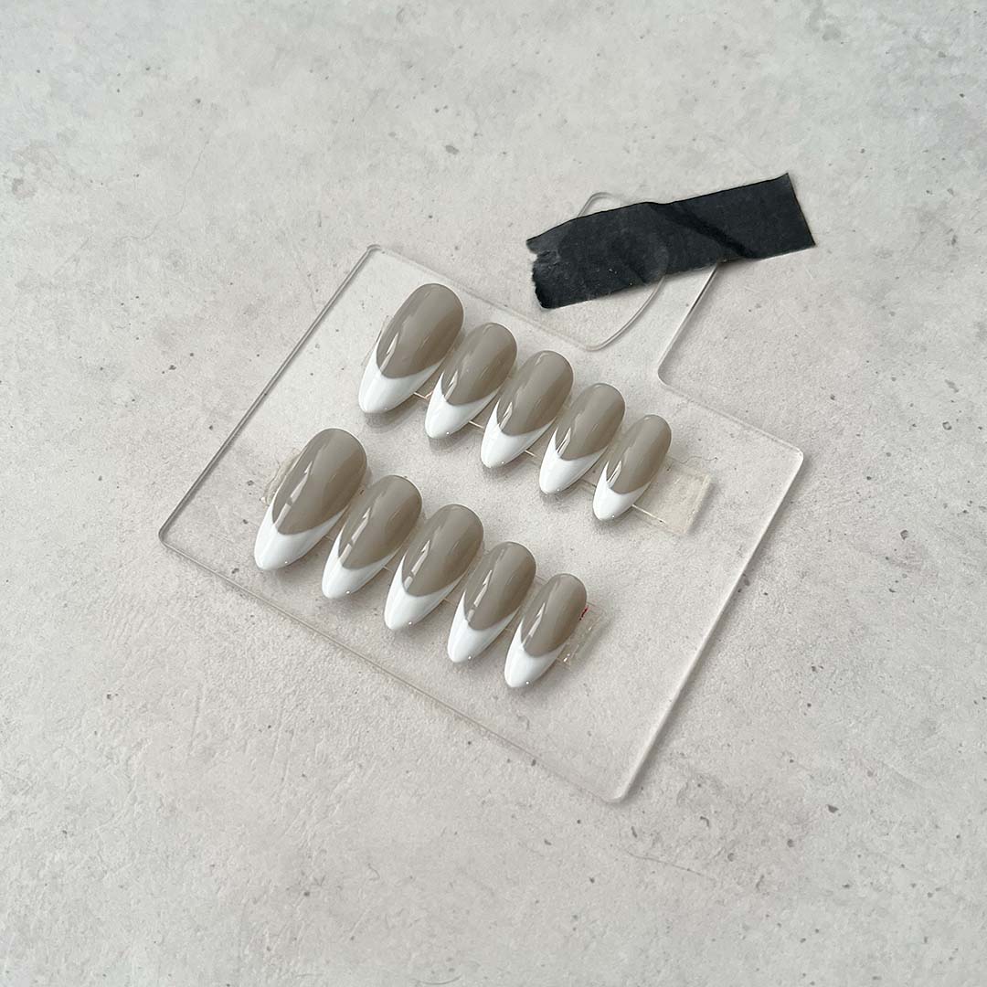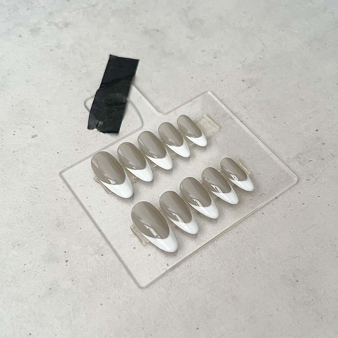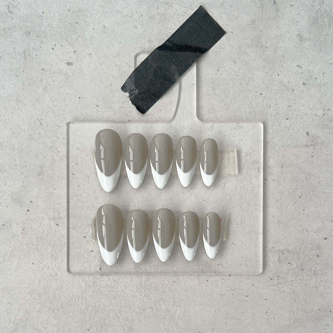 Sophisticated blend of understatement. Featuring a muted soft grey base complemented by classic white French tips. Wear this for a refined, timeless look.