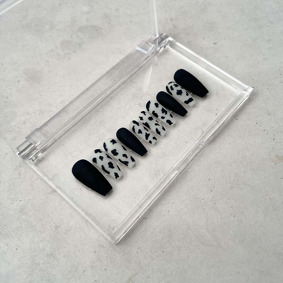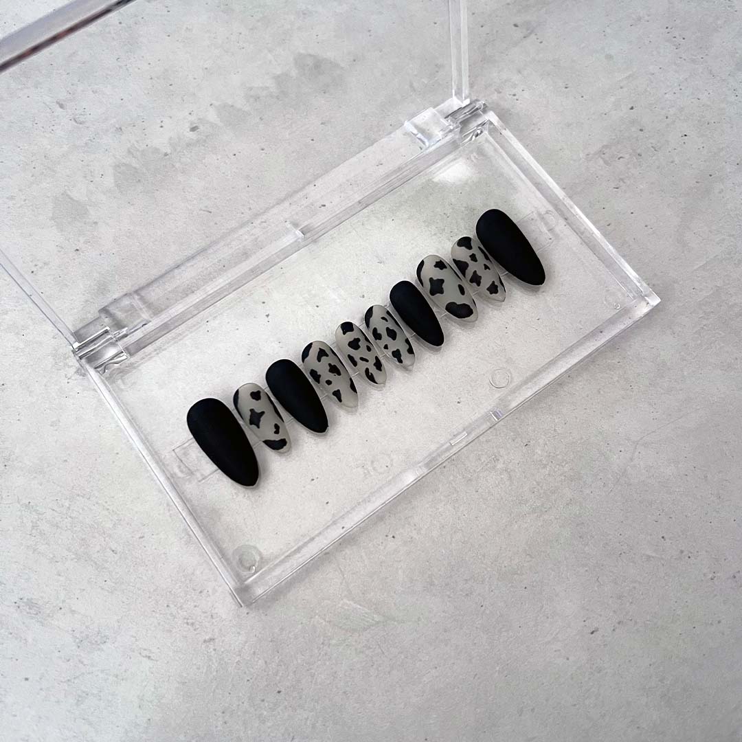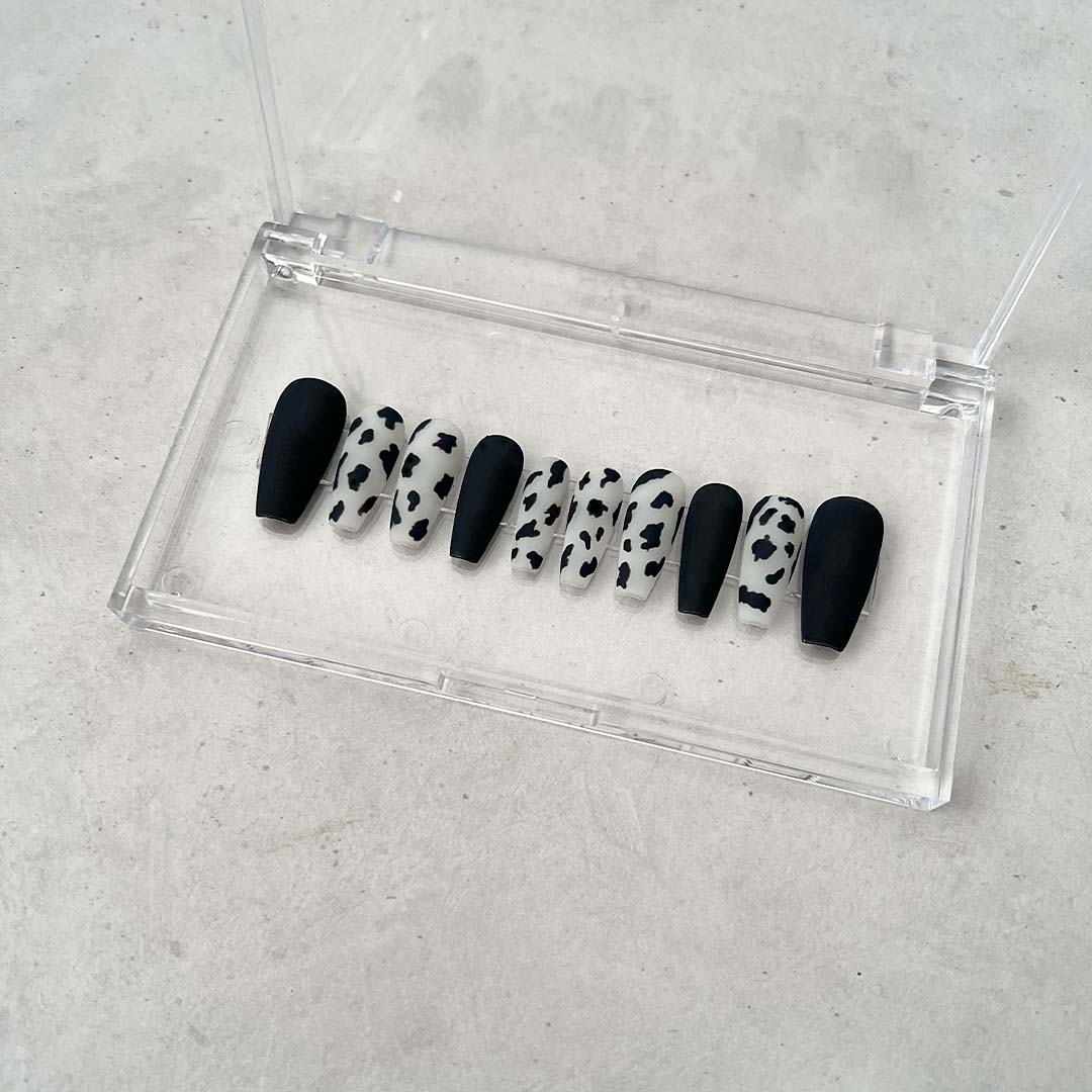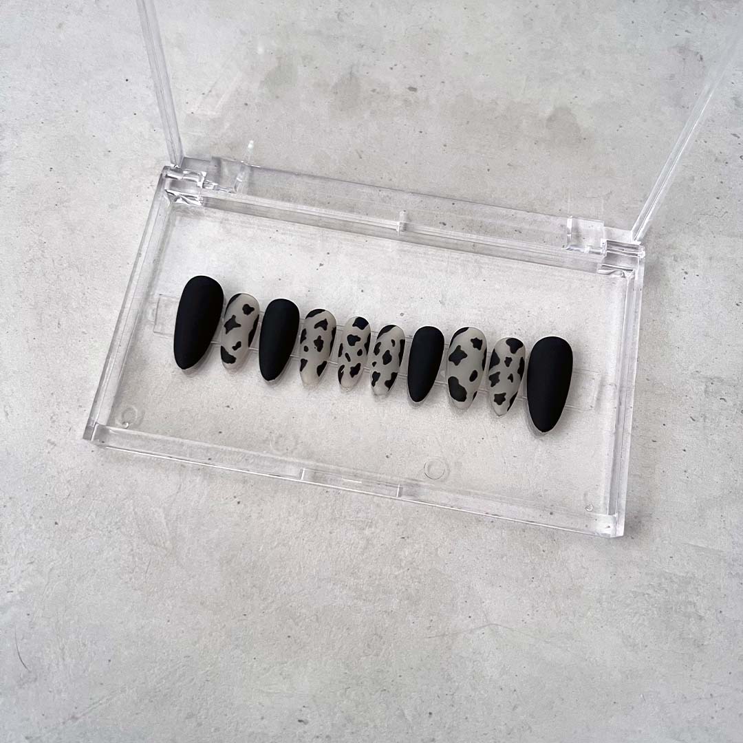 Bold matte finish with a daring cow print in contrasting black and white. Embrace your adventurous spirit and add an edgy touch to your look.