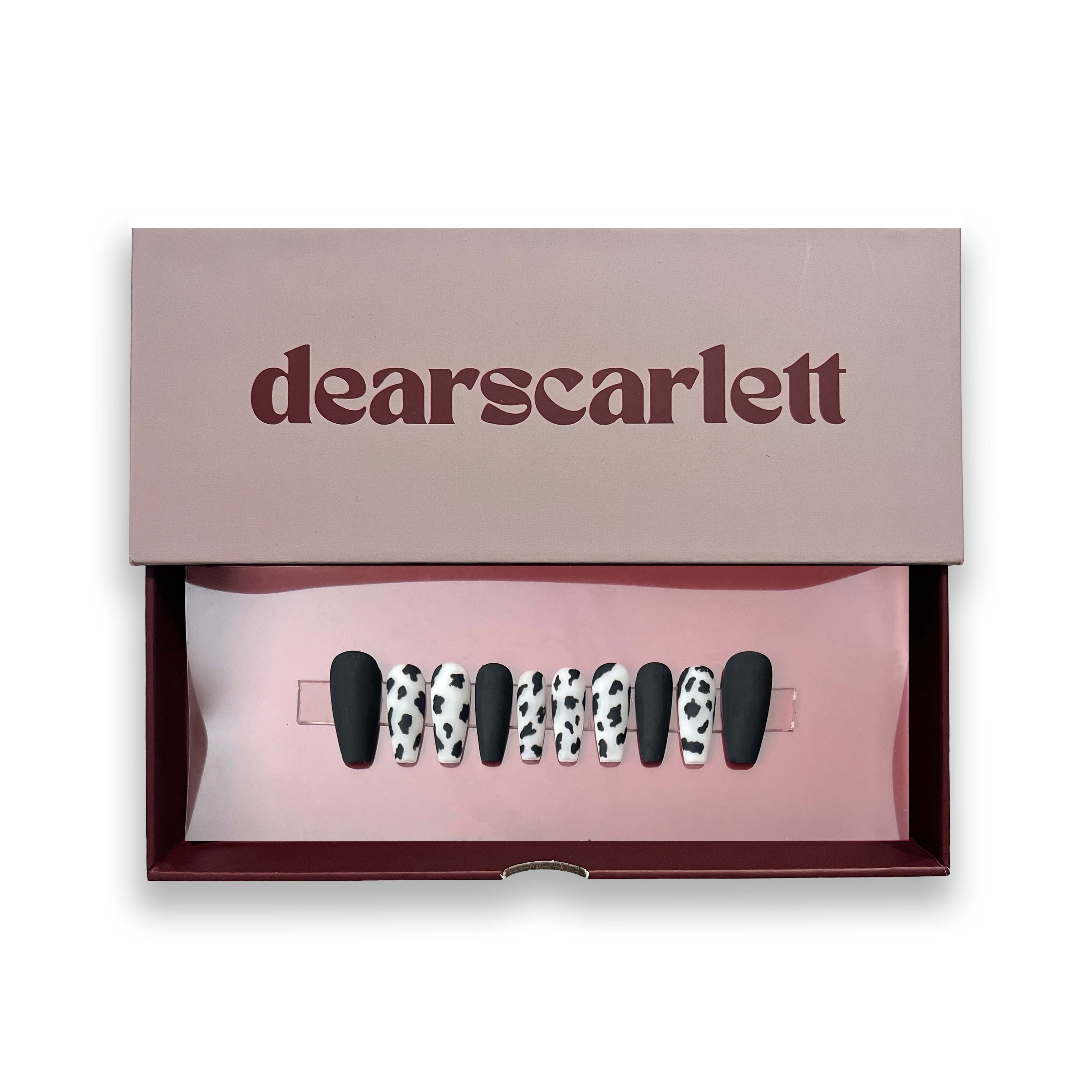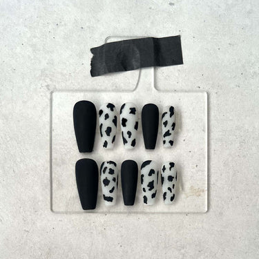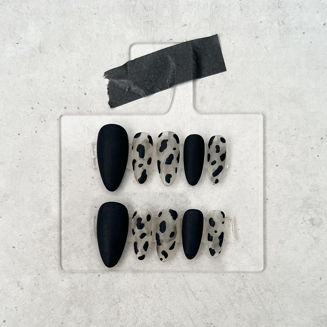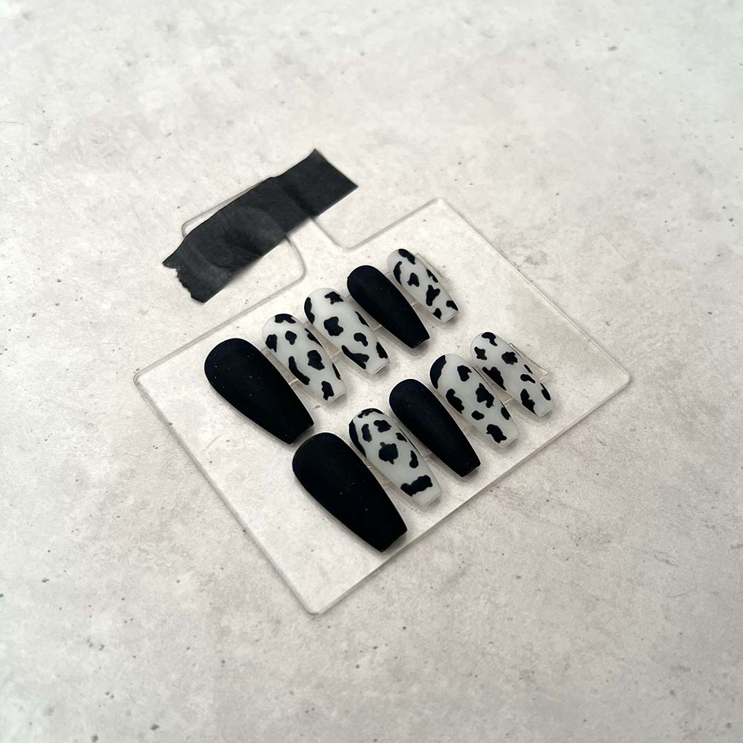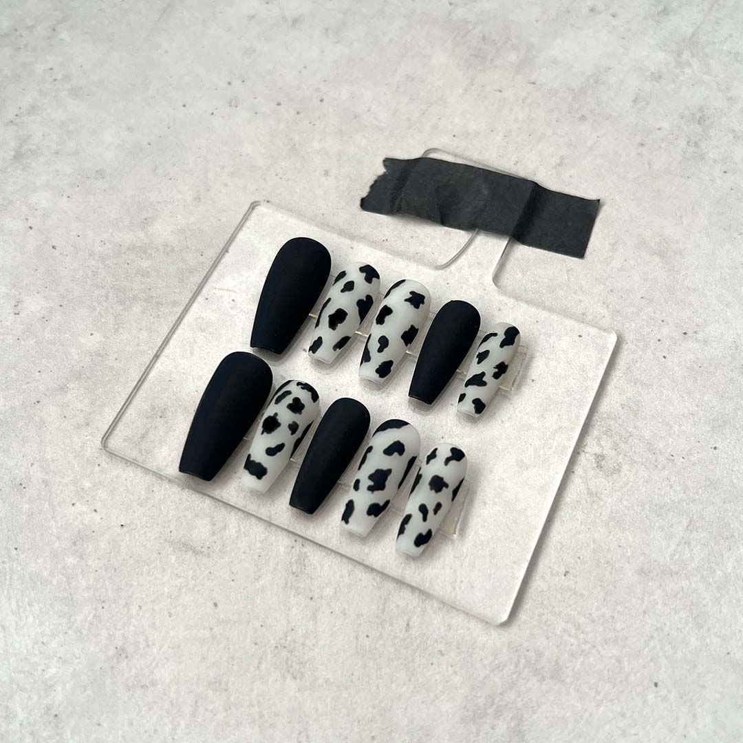 Bold matte finish with a daring cow print in contrasting black and white. Embrace your adventurous spirit and add an edgy touch to your look.
