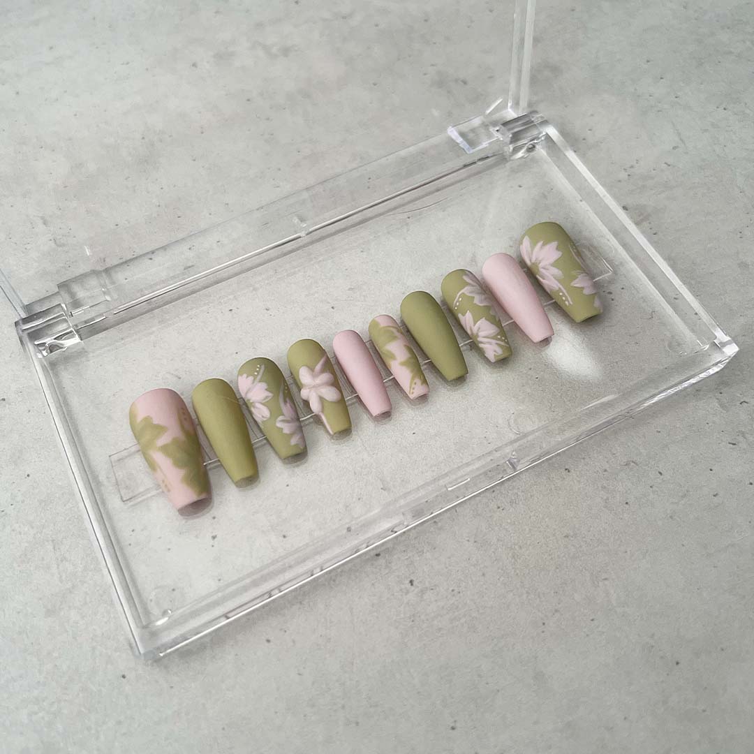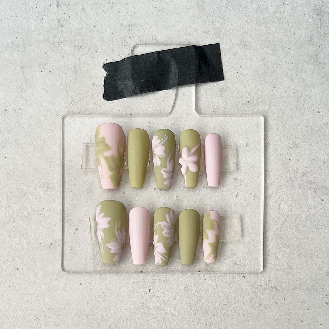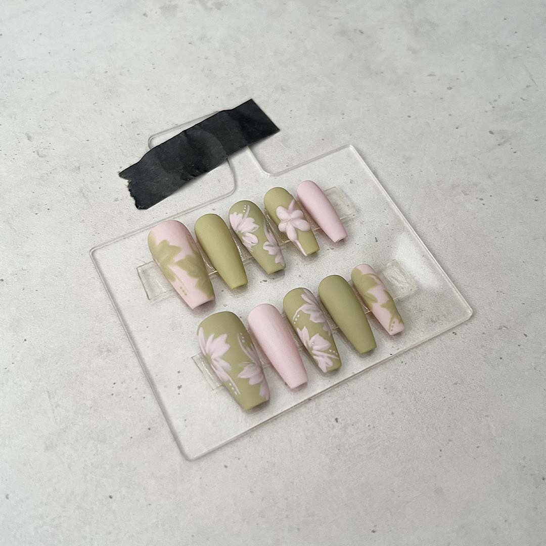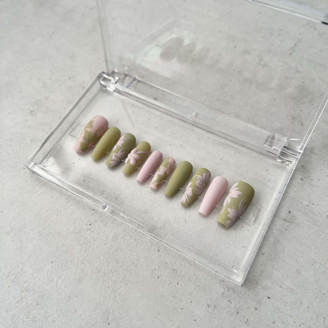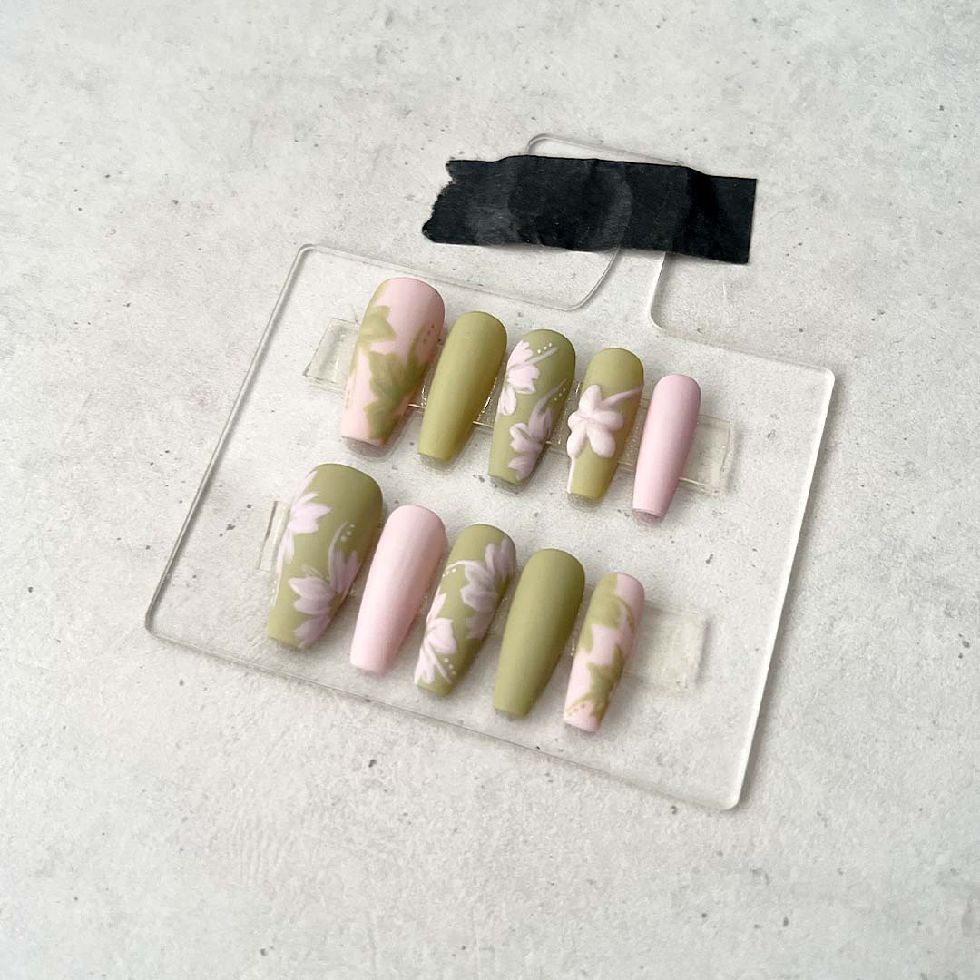Discover the charm of matching soft baby pink and muted sage base, paired with hand-drawn flowers and a matte finish to add uniqueness.